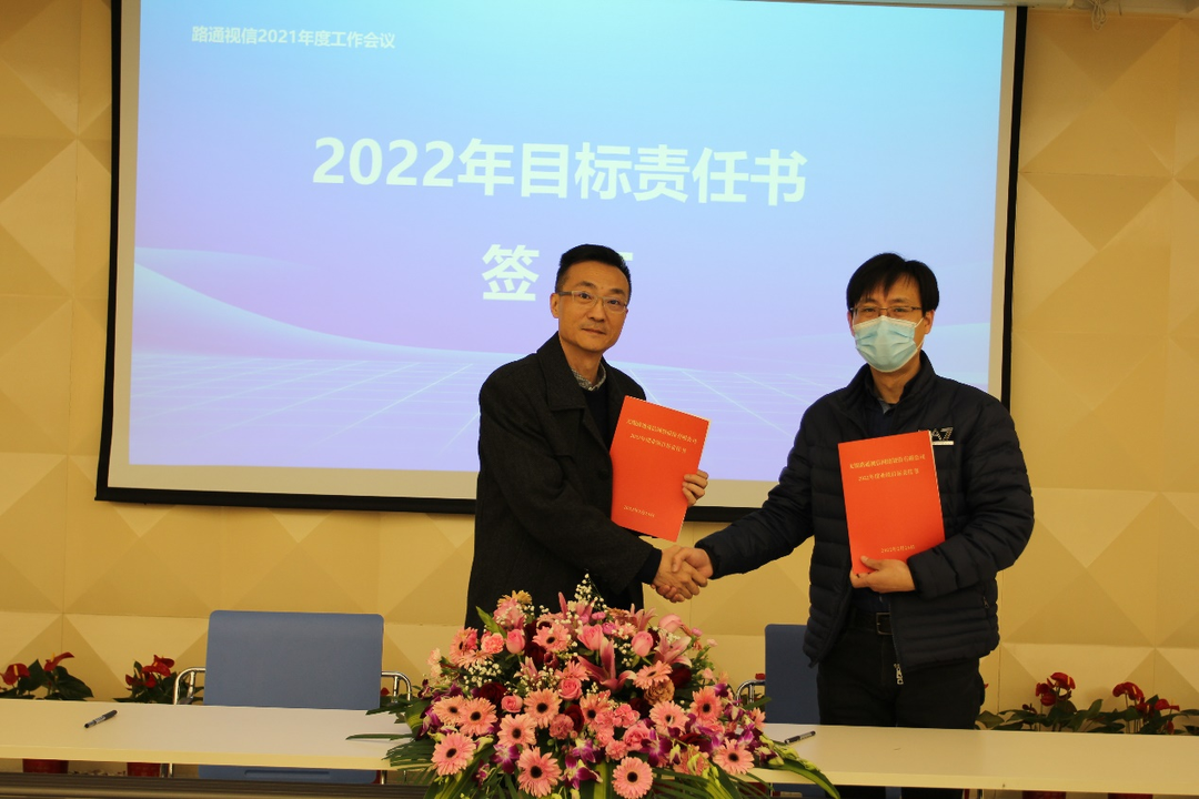 ▲图为蓝宇总裁与庄小正副总裁签订业绩目标责任书
